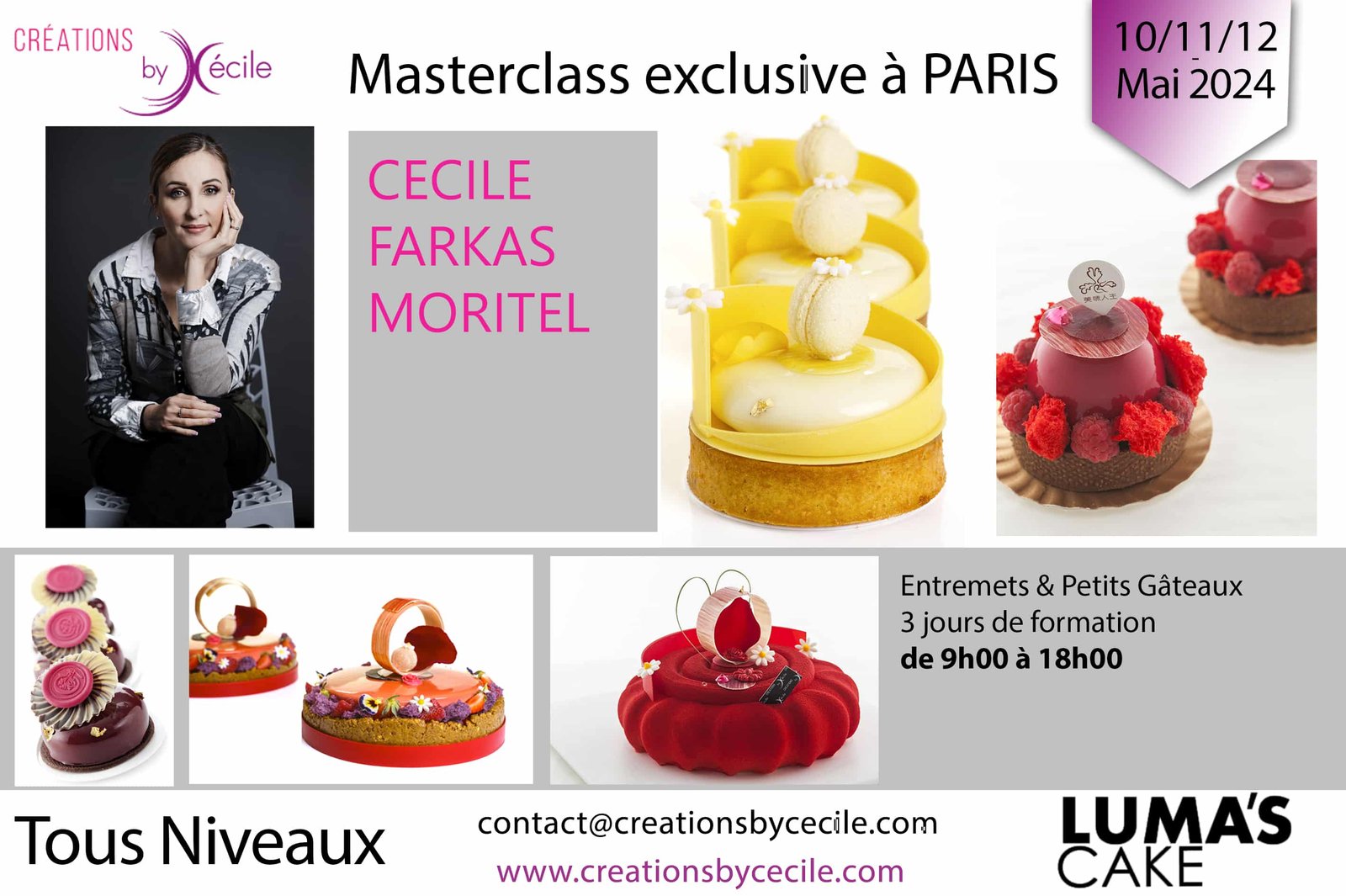 Il s’agit d’une masterclass de 3 jours en totale Immersion Professionnelle : Vous travaillerez en équipe de 2 stagiaires. Le but est de réaliser 12 recettes ( soient 80 sous recettes ) et de présenter un buffet final d’une centaine de gâteaux le dimanche en fin d’après-midi avec une remise de diplôme. Il y aura une dégustation et vous repartirez avec quelques réalisations.